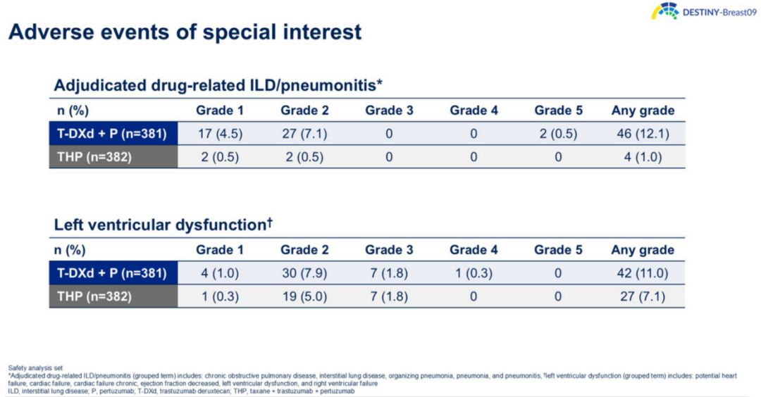 T-DXd最值得关注的不良反应是间质性肺炎(ILD)的发生率。DB-09研究中,T-DXd+P组患者任何级别间质性肺炎的发生率为12.1%,THP组为1.0%。不过,T-DXd+P组患者3-5级ILD的发生率较低,绝大多数患者ILD集中在1级和2级。总体而言,患者的不良反应尚可耐受。而且,随着T-DXd在临床治疗中应用时间的延长,已有关于T-DXd安全性管理的专家共识或管理路径,有助于我们更好地管理T-DXd的不良反应。