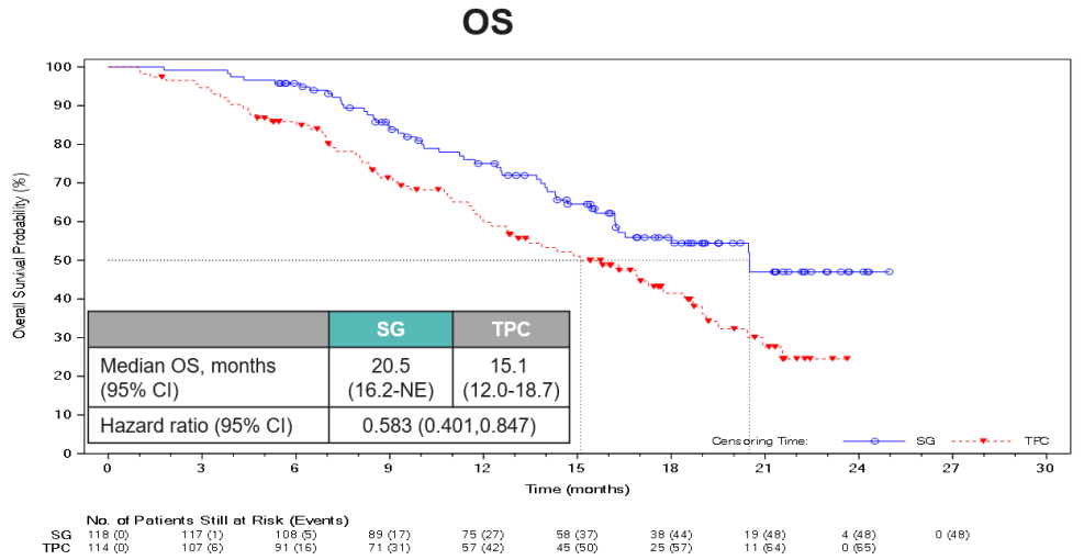 在OS方面,戈沙妥珠单抗较TPC同样取得了有临床意义的改善,为20.5个月vs 15.1个月,HR 0.583(95%CI:0.401-0.847),降低了41.7%的死亡风险,较全人群降低死亡风险程度具有更大获益的趋势。亚组分析显示,年龄<65岁、基线ECOG评分1分、HER2低表达、存在内脏转移、转移性阶段前序化疗3-4线患者、CDK4/6i经治患者显示了更大的OS获益趋势。