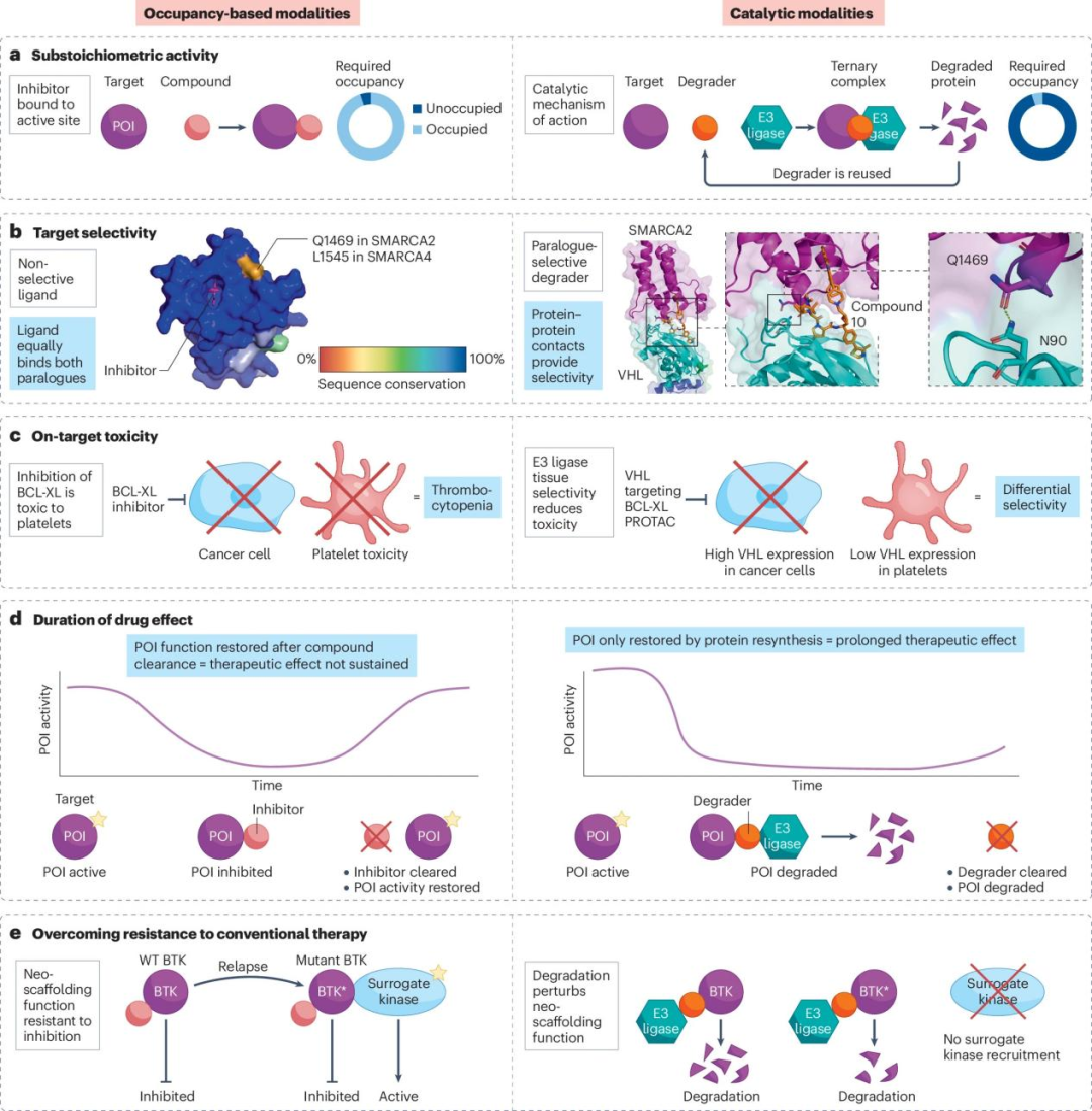 图4.PROTACs等“降解策略”相较传统“基于占位”治疗的优势