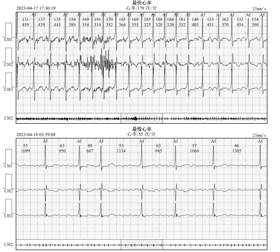 1.心房颤动,心室率:55-179次/分(平均:101次/分),可见室内差异性传导。最长RR间期19秒。