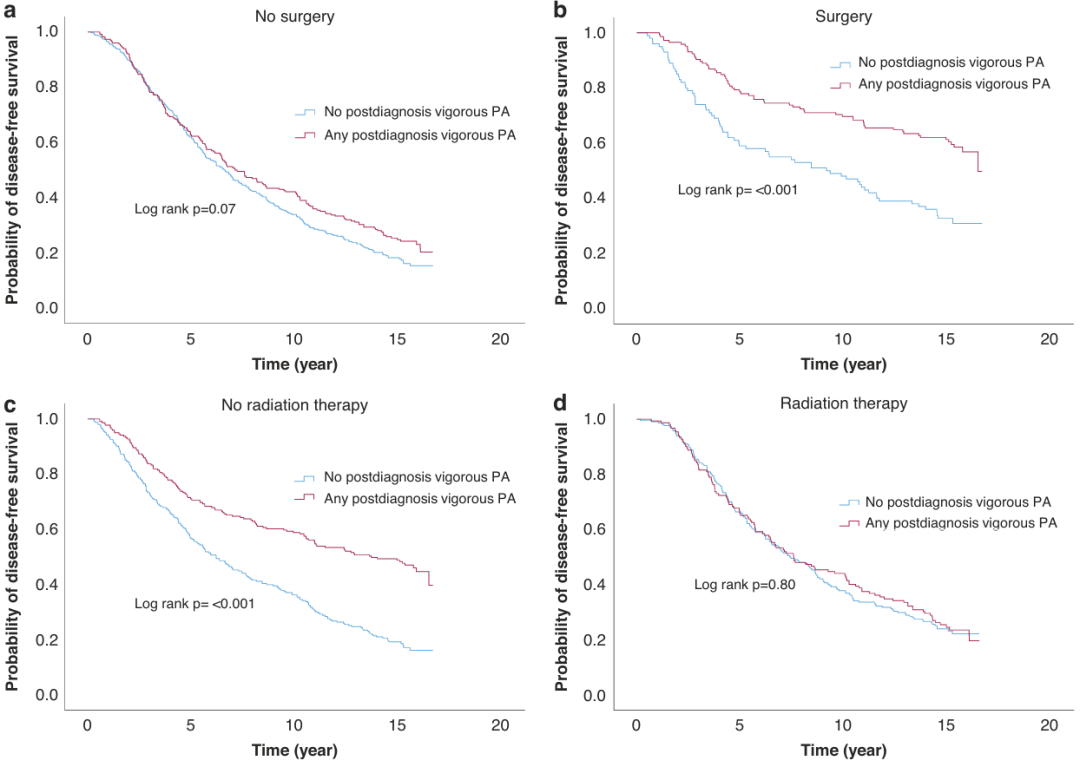 诊断后积极体力活动与手术(P<0.001)和放射治疗(P=0.003)之间存在显著的相互作用。在接受手术的患者中(n=245),与诊断后未进行积极体力活动的患者相比,积极体力活动的患者复发、进展、第二肿瘤或死亡的发生可能性降低了约60%(HR=0.39)。在未接受手术的患者中(n=585),诊断后积极体力活动的无病生存期无统计学显著差异(HR=1.00)。