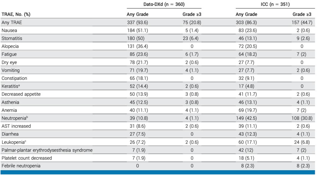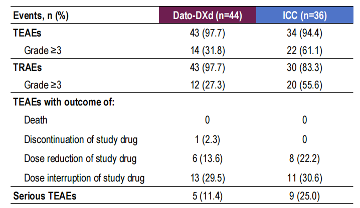 在安全性方面,中国患者与全球人群也表现一致,Dato-DXd组的≥3级TRAEs发生率不到化疗组的一半(27.3%vs 55.6%),其中≥3级的中性粒细胞计数减少症发生率相较化疗组降低10倍以上(2.3%vs 30.6%),≥3级的口腔炎发生率与化疗组相当(6.8%vs 2.8%),没有中国患者因Dato-DXd导致停药。中国队列中,Dato-DXd组整体的药物减量(13.6%vs 22.2%)和治疗中断(29.5%vs 30.6%)的患者比例也低于化疗组。