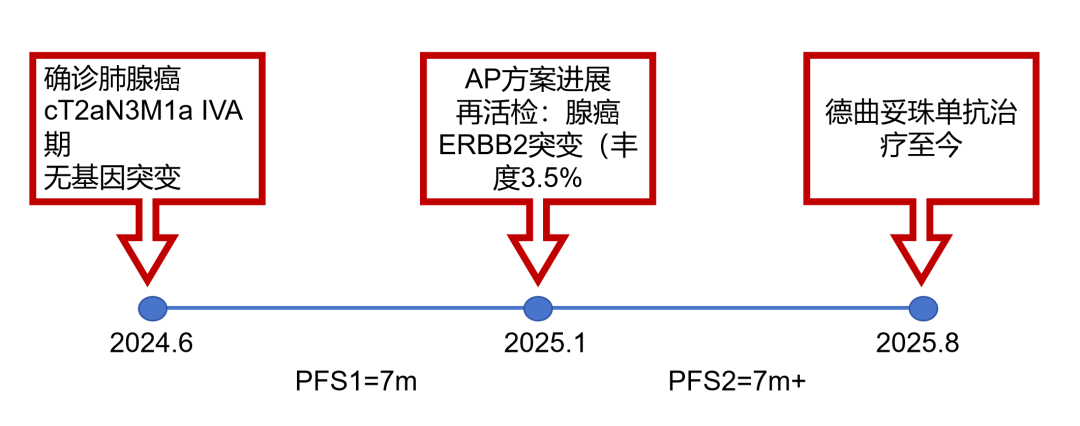 病例2:患者男,61岁。2023年8月于外院行肺CT提示:右肺下叶肿块。2023年10月23日于我院行单孔胸腔镜下右肺下叶切除术、肺门纵隔淋巴结扩清术。术后病理:腺癌低分化(腺泡型占30%,乳头型占30%,筛状占30%,微乳头占10%)。分期pT4N0M0 IIIA期。术后行基因检测提示HER2+(14%),PD-L1 2%+。术后行AC方案化疗4周期后行阿替利珠单抗维持治疗1年。末次用药时间:2024年11月1日。2025年2月复查肿瘤标志物升高,肺HRCT示:双肺多发结节,考虑转移。行血液基因检测提示:ERBB2 35.5%突变,CDK1 9.5%突变,MDM2 4.92%突变。患者DFS 14m,阿替利珠单抗停药后3个月出现复发转移,可见传统免疫治疗效果不佳。恰逢德曲妥珠单抗一线新尝试DESTINY-lung 04研究公布了入组标准和治疗方案,且该患在术后的组织基因检测和复发后的血液基因检测中都明确存在HER2突变,故行德曲妥珠单抗一线治疗。最佳疗效PR,目前治疗持续有效,PFS超过6个月。无药物相关不良反应发生。
