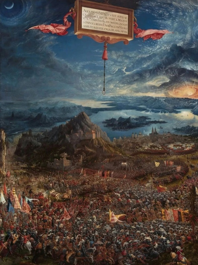 《亚历山大之战》,阿尔特多费尔(1529),现藏慕尼黑老绘画陈列馆。画面以俯瞰视角囊括山川、军队与天际,将伊苏斯战役的瞬间定格为浩瀚的历史长卷。图片来源:Google Arts&Culture
