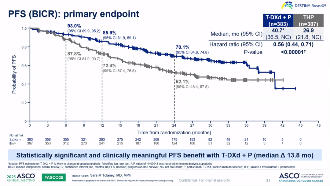 DESTINY-Breast09研究为患者带来了史无前例的超长PFS,深度的完全缓解率,以及初步的OS获益趋势,成功挑战了十余年来THP方案的一线标准治疗地位,为HER2阳性晚期乳腺癌走向治愈迈出了重要的一步。