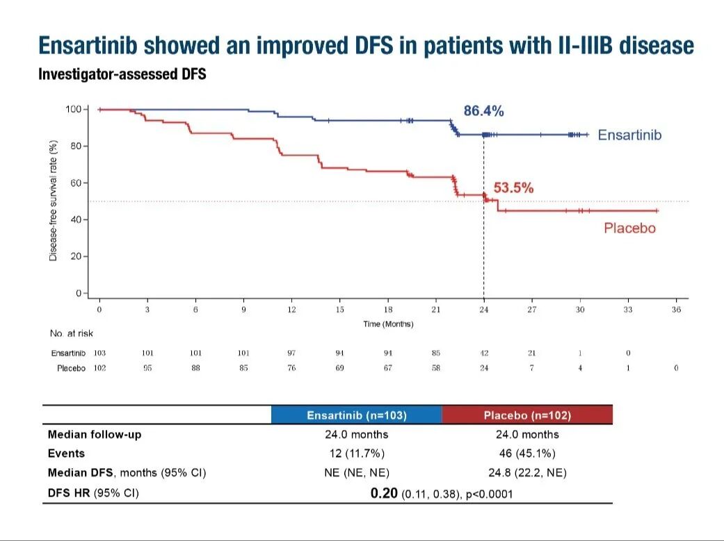 图1:在ELEVATE试验中,对于II-IIIB期NSCLC患者,化疗后使用辅助恩沙替尼与安慰剂相比,改善了DFS(2025年ESMO大会,LBA66)