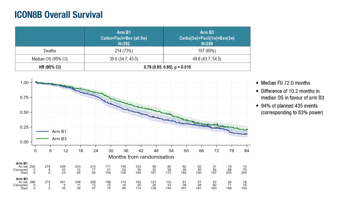 2.Clamp AR,et al.ICON8B:GCIG Phase III randomised trial comparing first-line weekly dose-dense chemotherapy+bevacizumab to three-weekly chemotherapy+bevacizumab in high-risk stage III-IV epithelial ovarian cancer(EOC):Final overall survival(OS)analysis.ESMO Congress 2025-Abstract 1064O