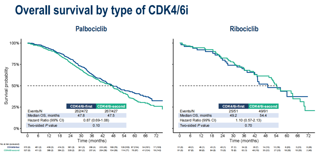 中位随访58.5个月时,共发生606例死亡(58%),263例(25%)患者仍在接受研究治疗。一线CDK4/6i组的中位OS为47.9个月,二线CDK4/6i组为48.1个月(HR 0.91;95%CI:0.77-1.07,P=0.24),未见显著或具有临床意义的差异。