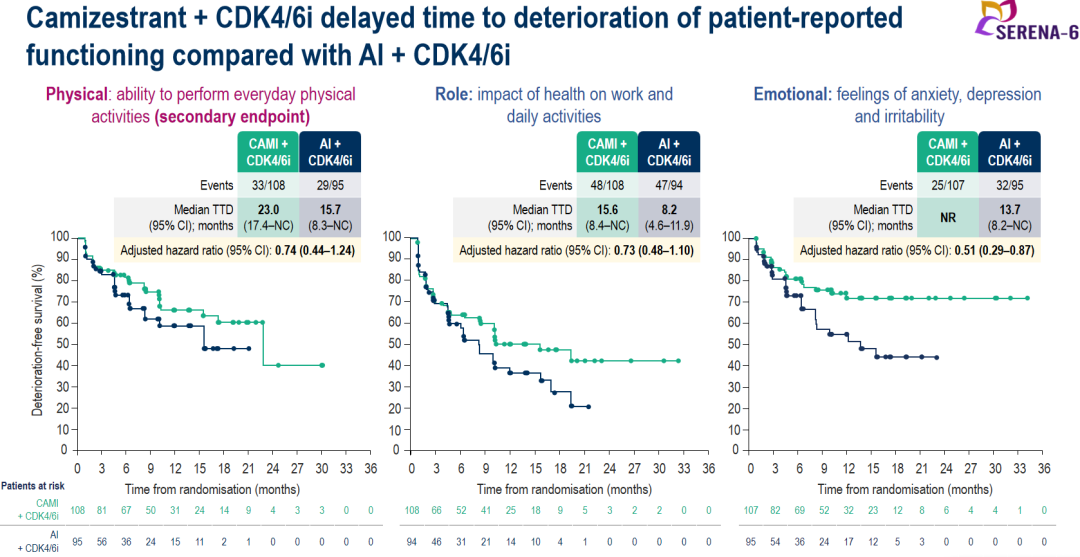 中位至疾病恶化时间(TTD)分析显示,Camizestrant+CDK4/6i改善了整体生活质量(GHS/QoL),延迟了疼痛、恶心、气短等症状TTD。此外,患者身体功能、角色功能、乳房症状和手臂症状的恶化风险下降。