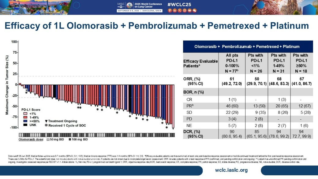 今年世界肺癌大会(WCLC)公布了二代KRAS G12C抑制剂Olomorasib联合化疗及免疫检查点抑制剂一线治疗KRAS G12C突变NSCLC的疗效与安全性。该分析汇总了LOXO-RAS-20001(37例)和SUNRAY-01(40例)研究数据,共77例患者。研究纳入晚期或转移性NSCLC患者,不限PD-L1表达水平,允许无症状脑转移患者入组。PD-L1<1%、1–49%和≥50%的患者比例分别为33.8%、40.3%和23.4%,18.2%伴脑转移。全组ORR为61.0%,DCR为90.0%。PD-L1<1%、1–49%和≥50%患者的ORR分别为50%、68%和67%,DCR分别为85%、94%和94%。中位随访9.7个月时,64%的患者缓解持续时间超过6个月。18.2%的患者因不良反应需降低Olomorasib剂量,7.8%永久停药。3级和4级治疗相关不良事件发生率分别为33.8%和15.6%,常见包括贫血(13.0%和1.3%)、谷草转氨酶升高(9.1%和1.3%)、中性粒细胞减少(7.8%和13.0%)。中位肝功能事件发生时间为43天,持续时间为4天。