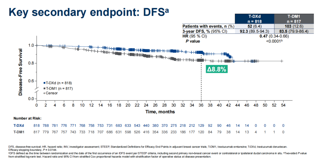 DB-05研究是一项全球多中心、随机、开放标签的III期临床试验,旨在评估T-DXd与T-DM1在高危HER2阳性早期接受新辅助治疗后仍有残留浸润病灶的患者辅助治疗中的疗效与安全性。研究共入组了1600多例患者,按1:1随机分配接受T-DXd或T-DM1治疗。主要终点为无浸润性疾病生存期(IDFS),关键次要终点为无病生存期(DFS),其他次要终点包括OS、无远处复发间期(DRFI)、无脑转移复发间期(BMFI)和安全性。