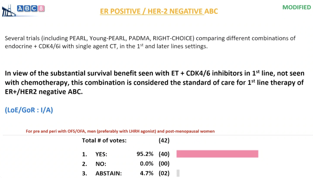 编者按:第八届晚期乳腺癌国际共识会议(ABC8)于当地时间2025年11月6~8日在葡萄牙里斯本举行。ABC共识指南是晚期乳腺癌领域首屈一指的国际性权威指南,汇聚了全球晚期乳腺癌领域的“意见领袖”级别专家,基于最新的循证医学证据对前沿和热议话题进行投票以达成共识,为全球晚期乳腺癌临床实践的革新和规范提供指导意见。肿瘤瞭望对ER+/HER2-晚期乳腺癌诊疗章节的专家意见和投票结果整理如下。