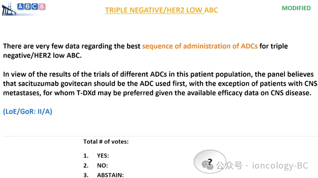 编者按:第8届晚期乳腺癌国际共识会议(ABC8)于当地时间2025年11月6~8日在葡萄牙里斯本举行。ABC共识指南是晚期乳腺癌领域首屈一指的国际性权威指南,汇聚了全球晚期乳腺癌领域的“意见领袖”级别专家,基于最新的循证医学证据对前沿和热议话题进行投票以达成共识,为全球晚期乳腺癌临床实践的革新和规范提供指导意见。肿瘤瞭望对晚期TNBC治疗相关问题的专家意见和投票结果整理如下。