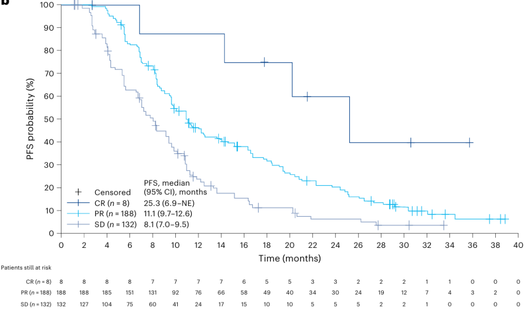 在总人群中,研究者评估的中位PFS在T-DXd组为8.8个月(vs.TPC组4.2个月;HR 0.36,95%CI 0.29-0.45)。T-DXd组24个月PFS率为14.5%。在HR+队列中,T-DXd组的研究者评估中位PFS为9.6个月(vs.TPC组4.2个月;HR 0.37,95%CI 0.30-0.46)。在HR-队列中,研究者评估的中位PFS在T-DXd组为6.3个月(vs.TPC组2.9个月;HR 0.29;95%CI 0.15–0.57)。