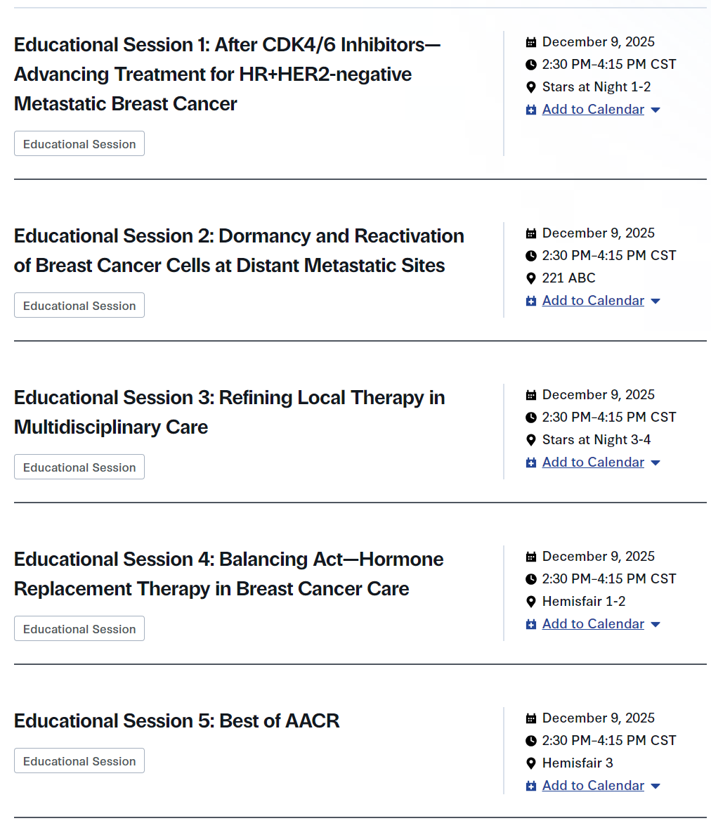 五场教育专场:1、教育专场1:CDK4/6抑制剂治疗后的进阶策略——HR+/HER2-转移性乳腺癌治疗新进展;2、教育专场2:乳腺癌细胞远处转移灶的休眠与再激活机制;3、教育专场3:精准化局部治疗在多学科诊疗中的优化实践;4、教育专场4:平衡之道——乳腺癌诊疗中的激素替代治疗管理;5、教育专场5:美国癌症研究学会(AACR)最新研究精粹。