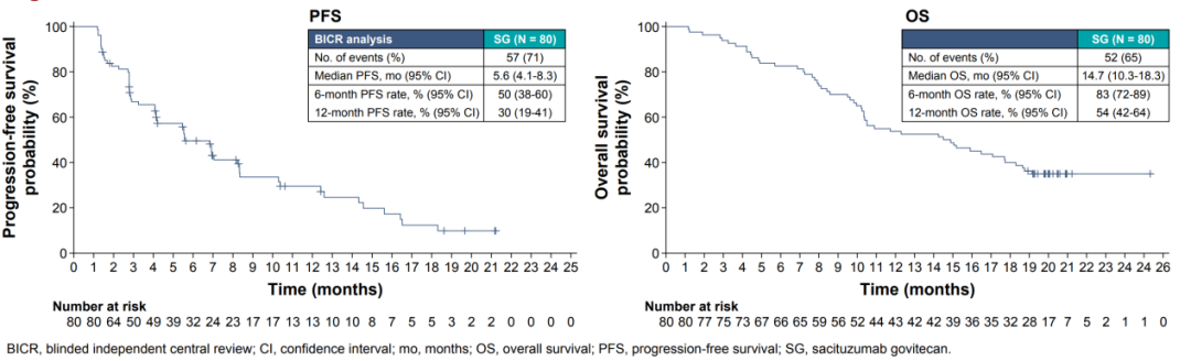 在我国的徐兵河院士领衔的EVER-132-001研究中,纳入了我国80例经过≥2种标准治疗方案后进展的、无脑转移的局部晚期或转移性TNBC患者,结果显示戈沙妥珠单抗的mPFS为5.6个月,mOS为14.7个月,与ASCENT研究表现一致[13]