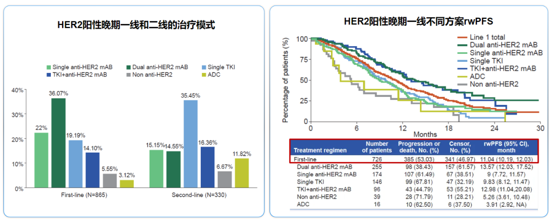 以我国学者2025年发表的一项真实世界分析为例,研究收集了2020-2022年5家中心865例HER2阳性不可切除或转移性乳腺癌患者的治疗模式和临床结局资料,其中一线治疗常用方案依次为HP双靶方案(36.07%)、曲妥珠单抗单靶治疗(22%)和曲妥珠单抗+TKI方案(19.9%),双靶方案应用比例明显低于国外真实世界数据;治疗模式不均一和患者特征差异,也影响了真实世界PFS(rwPFS)数据,全部患者的一线治疗rwPFS仅为11.04个月[6]