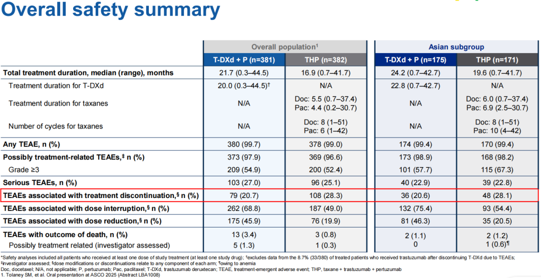 本次公布的DB-09研究亚洲人群分析数据,覆盖T-DXd+P组(n=174)和THP组(n=172)亚洲患者,占研究相应治疗组患者总数约50%,两组患者基线特征整体可比,与全球人群也大致相似,如激素受体(HR)阳性患者占比约46.5%,初诊(de novo)复发/转移患者占49.4%,中位随访时间为30.2个月(截至2025年2月25日)。