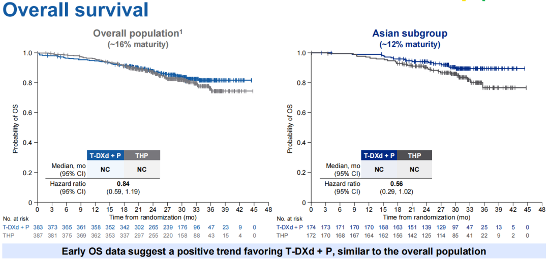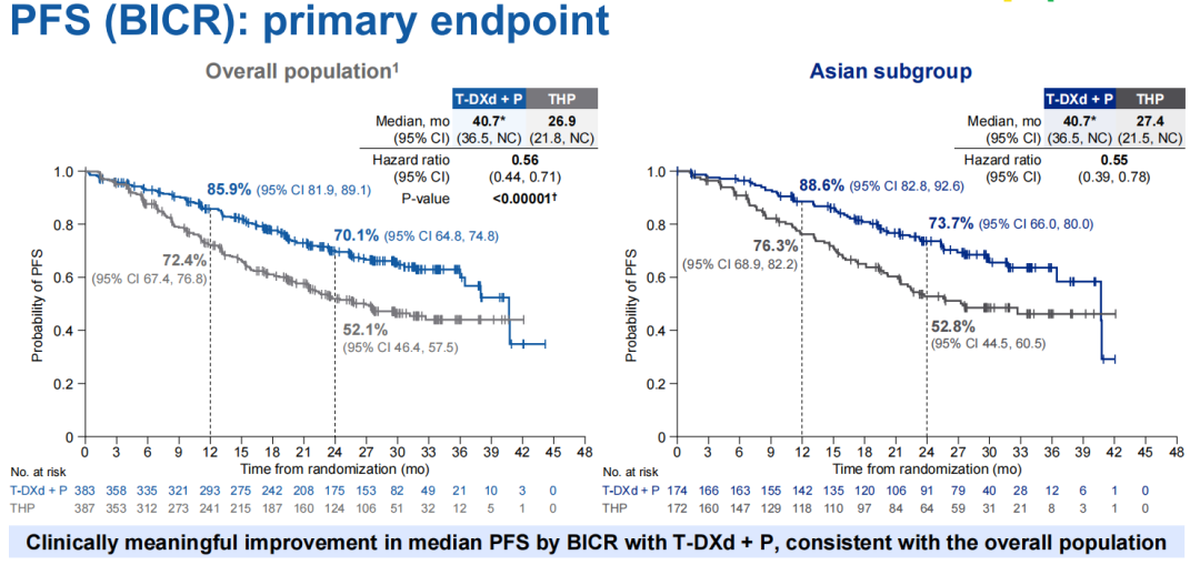 分析数据显示,T-DXd+P组和THP组亚洲患者由盲态独立中心评估(BICR)的mPFS为40.7个月和27.4个月,两组24个月PFS率为73.7%对52.8%,T-DXd+P方案使患者疾病进展或死亡风险显著下降45%(HR 0.55,95%CI:0.39-0.78),由研究者评估的mPFS也呈现一致趋势(40.7个月vs.21.5个月,HR 0.47,95%CI:0.33-0.65),上述数据呈现的T-DXd+P组获益趋势,也与研究全球人群数据保持一致(mPFS,40.7个月vs.26.9个月,HR 0.56)。
