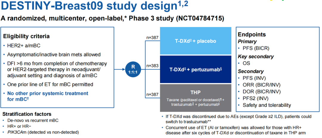 DB-09研究是一项随机、开放标签、国际多中心III期临床研究,旨在评价T-DXd±P方案对比标准THP方案一线治疗HER2阳性复发/转移性乳腺癌患者的疗效和安全性;研究共入组1157例患者(允许曾使用1线内分泌治疗,不允许既往化疗或HER2靶向治疗),按1:1:1比例随机分组后,予T-DXd单药治疗、T-DXd+P方案或既往标准治疗THP方案为对照。