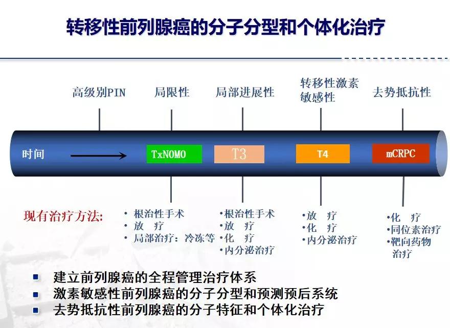 关于mCRPC,大家都知道,mCRPC在我们中国还是属于一个非常高发的疾病。因为在中国的前列腺癌患者中有1/3被发现时是早期的,1/3被发现时是局部进展性的,还有1/3是发现时就是转移性的前列腺癌。对于后两部分患者的内分泌治疗过程中,很大部分患者难免会进入mCRPC阶段。实际上在近几年,前列腺癌的治疗进展已经非常快了,尽管在新的治疗方式下,包括新型内分泌治疗、联合化疗、免疫治疗等;但到了mCRPC后,总体的治疗有效时间还是只有2-3年左右。但对于前列腺癌患者来说,哪怕到了mCRPC后,许多患者一般身体状况还是很好,我们还是希望能给患者更加有效的治疗,延长患者的生存时间。这也是我们在精准医学时代想做的事情。