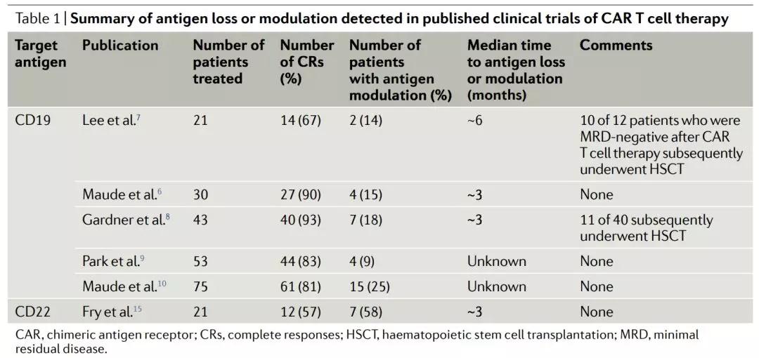 表 1 | 汇总:已发表CAR T细胞治疗的临床试验:检测到的抗原丢失或水平调节的数据。