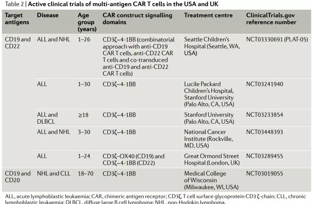 表 2 | 目前正在USA和UK进行的多抗原CAR T 细胞治疗临床试验
