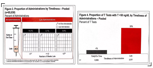 2019 EAU报道的一项来自美国的真实世界研究(摘要:904)显示,临床中存在LHRH激动剂给药时间不规律,甚至是延迟给药的情况,用药晚或间隔时间过长而造成睾酮水平过高,PSA也相继会增高,这时候患者紧张,也给我们临床医生造成困扰。这是因为患者进入去势抵抗前列腺癌(CRPC)阶段?还是对睾酮水平抑制的不够?还是应考虑是其他原因造成的?这个研究细致的分析了这种原因。