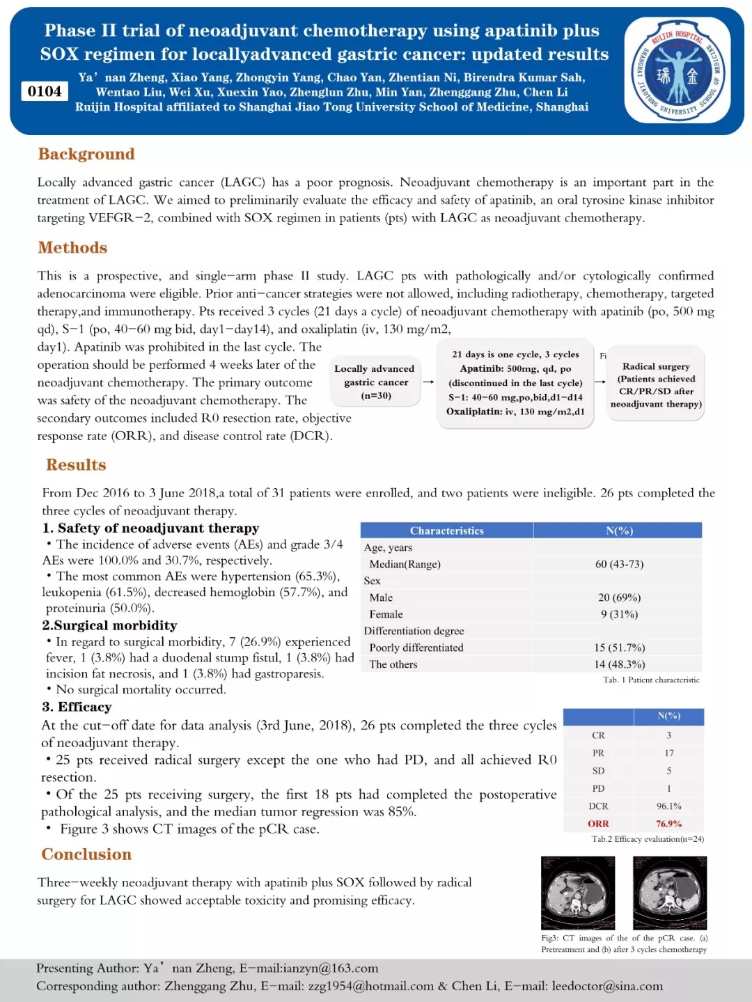 而在本次会议上展示的另一项来自中南大学湘雅二医院姚宏亮教授团队的研究同样证实了阿帕替尼联合SOX方案对进展期胃癌术前治疗的有效性(见本文后的研究链接),从而为开展该方案的Ⅲ期临床研究,以及未来该方案作为新辅助化疗治疗进展期胃癌增添了新的循证医学证据支持。