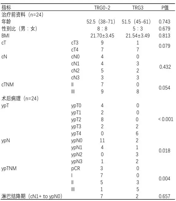 结果:24例患者基线资料:中位年龄52.5岁,最小年龄38岁,最大年龄71岁;男女比例13:11;体重指数21.59±3.40。24例患者治疗前临床分期(cTNM)资料:临床Ⅱ期7例,临床Ⅲ期17例。其中cT3期10例,cT4期14例;cN0期4例,cN1期7例,cN2期7例,cN3期6例;所有患者均无远处转移。24例患者术后病理(ypTNM)资料:病理完全缓解3例,病理Ⅰ期7例,病理Ⅱ期8例,病理Ⅲ期6例。其中ypT0期4例,ypT1期2例,ypT2期8例,ypT3期4例,ypT4期6例;ypN0期13例,ypN1期5例,ypN2期3例,ypN3期3例。肿瘤退缩分级:TRG0级3例,TRG1级5例,TRG2级8例,TRG3级8例(表1)。肿瘤退缩有效率66.7%(表2,图1,图2)。9例患者实现淋巴结降期,降期比率37.5%。