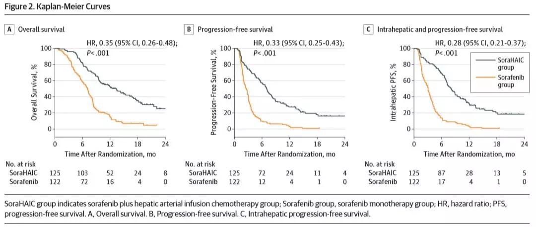 本研究在2016年4月1日至2017年10月10日期间共纳入中国5家医院的818例患者,其中有247例肝细胞癌门静脉侵犯的患者入组本次研究并进行为期10个月的随访,其中男性患者223例,女性患者24例,年龄在18-75岁,中位年龄为49岁。通过计算机序列随机对这些患者进行分配(1:1)以接受400mg索拉非尼每日2次(Sorafenib组)或400mg索拉非尼每日2次加HAIC(SoraHAIC组)(奥沙利铂85mg/m2,亚叶酸钙400mg/m2,第一天氟尿嘧啶400mg/m2,氟尿嘧啶输注2400mg/m2,持续46小时,每3周)。研究的主要终点是患者的总生存期(OS)。在接受至少1剂研究治疗的患者中评估治疗安全性。