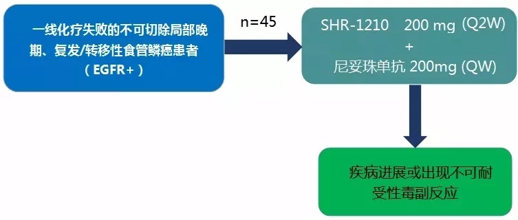 给药方案:SHR-1210 200 mg (Q2W),联合尼妥珠单抗200 mg (QW),直到疾病进展或出现不可耐受性毒副反应。按RECIST V1.1标准每6周评价疗效。