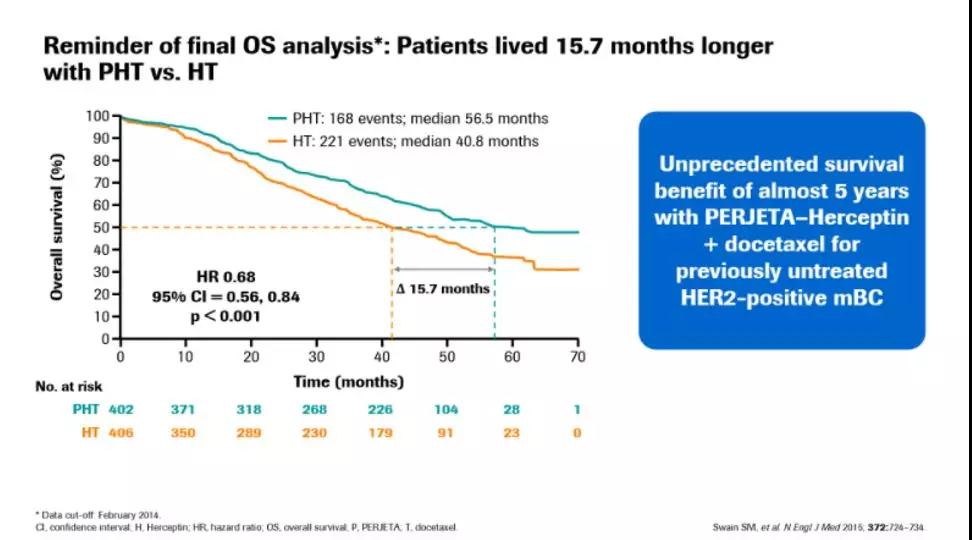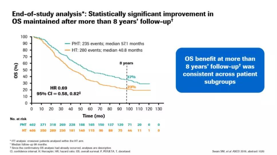 此次我在2019ASCO大会上报告这项研究的最终生存分析数据(截止至2018年11月的生存数据),并确定患者OS结果。随访8年的里程碑式分析显示:接受帕妥珠单抗+曲妥珠单抗“双靶治疗”患者仍有37%的存活,而接受曲妥珠单抗治疗的患者仅有23%存活。这表明OS率至少有14%的改善,中位OS大约有16个月的改善,所以这一点得到了支持。这对患者来说是非常令人兴奋的,因为在过去,他们除了曲妥珠单抗治疗以外不会有更好的生存获益,从而面临死亡的威胁。因此,帕妥珠单抗+曲妥珠单抗“双靶治疗”确实改变了这些患者的轨迹和结果,部分患者甚至可能实现治愈,并且极大地改善了他们的生活。