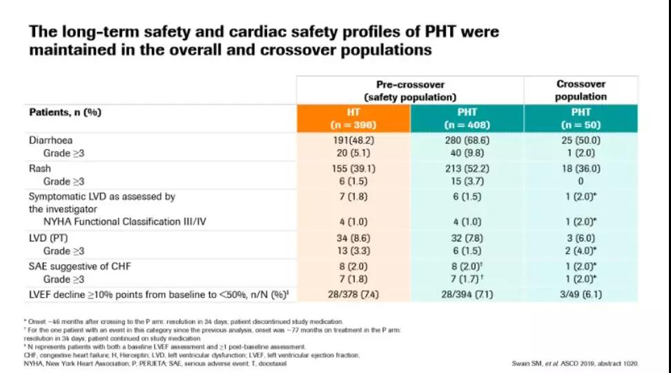 同时研究还表明:尽管许多患者仍在接受“双靶治疗”,但正如我们所预期的那样,增加帕妥珠单抗并没有增加毒性。直到2018年11月,仍有大约59名患者(约15%患者)在接受双靶治疗,这是一个很大的数字。所以,看到这个积极的数据确实很激动人心,因为这是我们目前在转移性乳腺癌患者中见过的最长的生存获益。