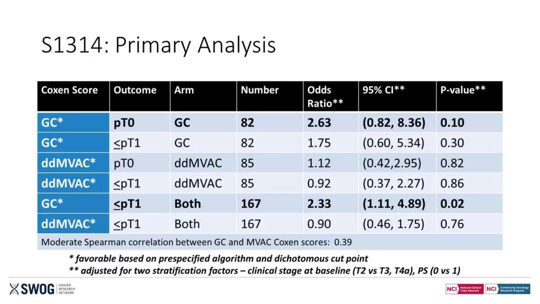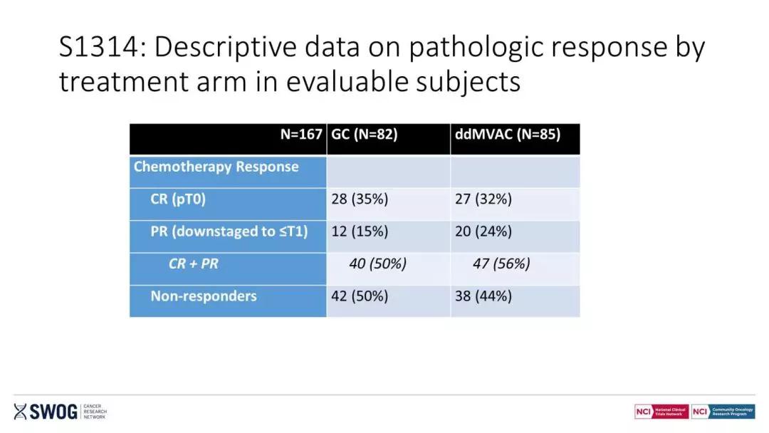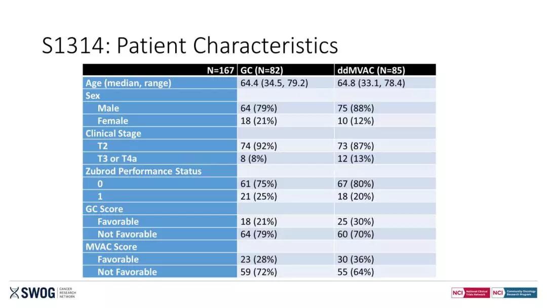 结果:最终纳入167例患者,其中ddMVAC组的中位年龄为65岁,GC组的中位年龄为64岁;ddMVAC组80%患者PS=0,GC组75%患者PS=0;ddMVAC组男性比例为88%,GC组男性比例为79%;ddMVAC组T2期患者占87%,GC组T2期患者占92%。所有患者在100天内至少都进行了3个周期的化疗。ddMVAC组COXEN评分为32%,GC组COXEN评分评分为26%。ddMVAC组和GC组的pT0率分别为32%和35%; ≤pT1的比率分别为55%和49%。