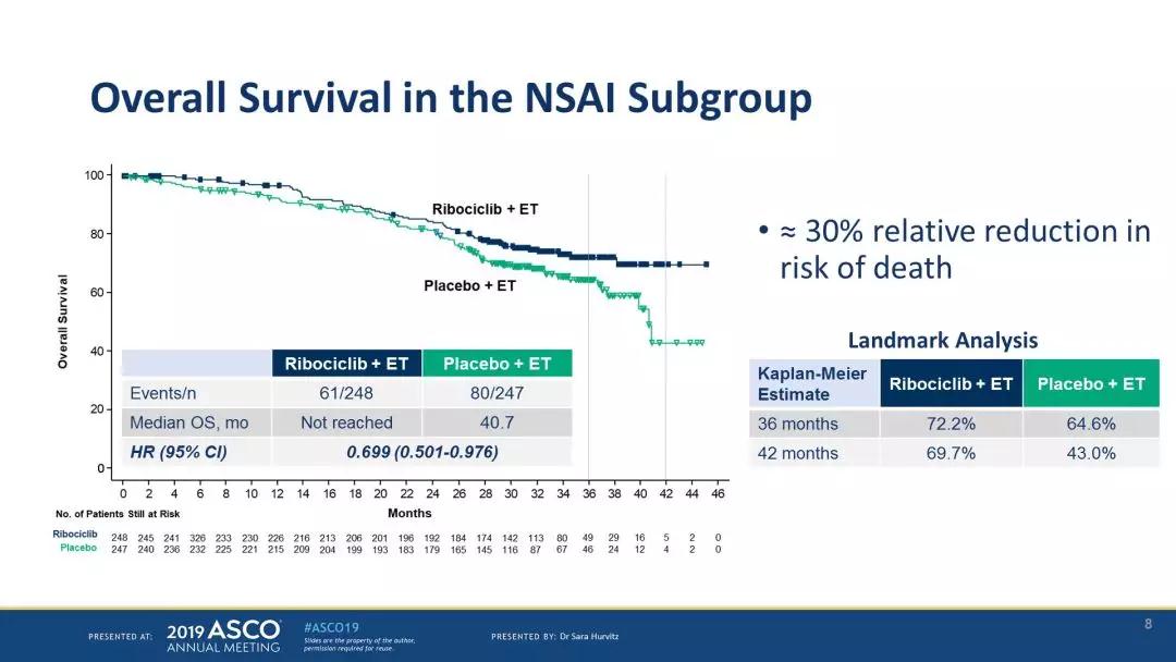 此外,Ribociclib+AI亚组的OS改善更好一些,风险比是0.699,也就是说可以减少的死亡风险达到30%。在此结果出现之后,大家在临床上遇到绝经前的、激素受体阳性的病人,在给病人治疗建议上面可以提出这样的选项,让病人了解目前有这样的数据,在临床治疗上面它是一个可行的选项。