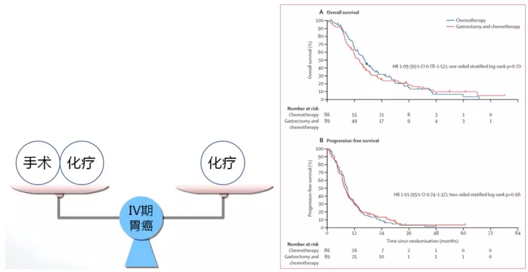 REGATTA研究是针对晚期胃癌患者进行的一项Ⅲ期随机对照试验,目的是评估减瘤手术的价值。研究结果显示,与姑息化疗相比,减瘤手术并不能延长患者的预后(图1)[1]。