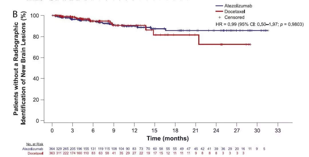 在经治无症状脑转移患者中,影像学上发现新病灶的中位时间atezolizumab组尚未达到,多西他赛组为9.5个月(HR=0.38,95%CI:0.16-0.91;p=0.0239)。而在无脑转移患者中两组中位时间均尚未到达,无显著差异[4](图2)。这提示atezolizumab可能有预防新发脑转移灶的作用。