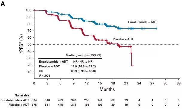 ARCHES研究是一个多中心随机、安慰剂对照的III期临床研究,它对比了ADT联合恩杂鲁胺及ADT联合安慰剂治疗无症状或轻度症状的M-HSPC患者的有效性及安全性数据。该研究选取了共202个中心2016年3月至2018年1月的M-HSPC患者共1150例,1:1随机分组,最终1146例患者入组用药。其中727名患者(63.2%) 为高肿瘤负荷患者(CHAARTED高肿瘤负荷定义),同时该研究还纳入了205名(17.9%)既往接受过多西他赛化疗的患者以及145名(12.6%)既往接受过放疗的患者。该研究以rPFS(包括治疗结束后24个月之内发生的未发生影像学进展的死亡)作为主要研究终点,以至PSA进展时间(TTPP)、至新的抗肿瘤治疗时间(TTNAT)、PSA反应率、至排尿症状恶化时间、总生存(OS)作为次要终点,其他次要终点还包括至有症状的骨相关事件时间、至去势抵抗时间、至生活治疗恶化时间以及至疼痛进展时间。中位随访时间14.4个月。