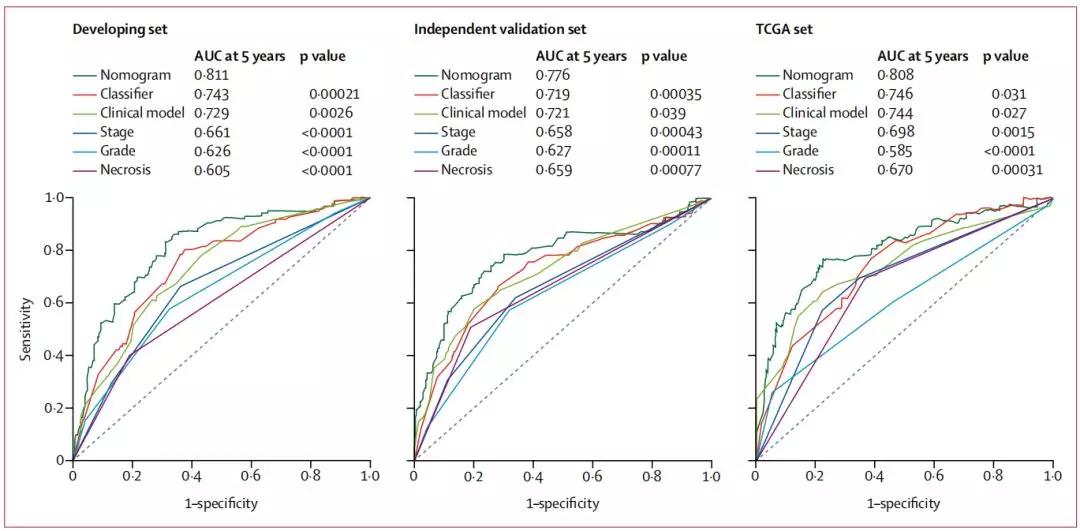 研究结果显示,虽然在具有完整SNP信息的内部测试集206例中有48例(23%)存在瘤内异质性,但在训练集中的三个不同区域(5年曲线下面积[AUC])基于6个SNP的分类器的预测精度是相似的:在区域1中为0.749 (95% CI:0.660-0.826),在区域2中为0.734(95%CI:0.651-0.814),在区域3中为0.736(95%CI:0.649-0.824)。基于六个SNP的分类工具精确预测了三个验证集中患者的无复发生存率(内部测试集HR=5.32[95%CI:2.81-10.07],独立验证集HR=5.39 [95%CI:3.38-8.59]在中,TCGA集中为4.62[ 95%CI:2.48-8.61];所有集中p<0.0001),并且与患者年龄、性别、肿瘤分期、分级、坏死程度无关。将分类工具和临床病理学危险因素(肿瘤分期,分级和坏死)结合起来构建列线图,其预测准确性显著高于单独的每个变量(5年AUC为0.811 [95%CI:0.756-0.861])。