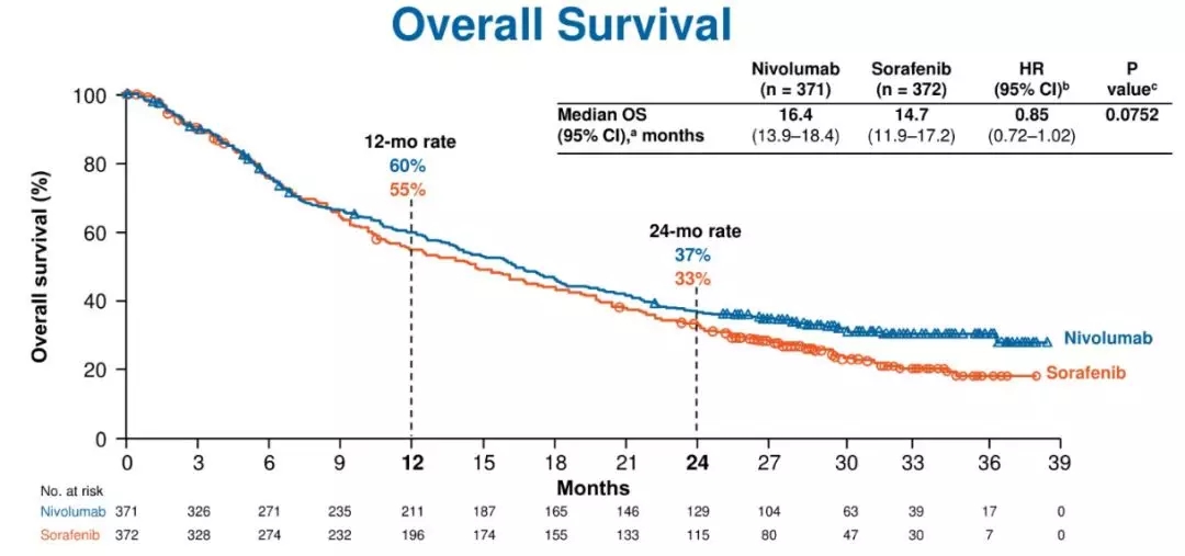 相比于索拉非尼,纳武利尤单抗治疗延长了总生存期(OS),尽管无统计学意义(P=0.0419):纳武利尤单抗组中位OS为16.4个月,索拉非尼组为14.7个月(P =0.0752);纳武利尤单抗组12个月OS发生率为59.7%(95%CI:54.4%~64.6%),索拉非尼组为55.1%(95%可信区间为49.8%~60.1%);24个月的OS发生率分别为36.8%(95%CI:31.8%~41.8%)和33.1%(95%95%CI:28.3%~38.0%)。