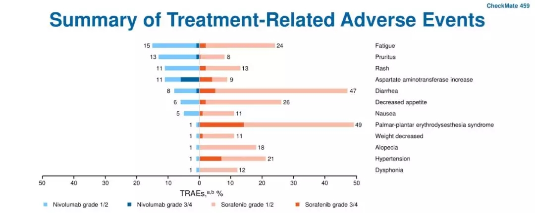 图4. 纳武利尤单抗和索拉非尼组治疗中不良事件的发生率