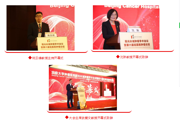 大会开幕式由北京大学肿瘤医院姚云峰教授主持。姚教授介绍了此次学术论坛的背景与内涵以及与会的国内外专家,并对所有与会嘉宾表示衷心感谢和热烈欢迎。大会名誉主席沈琳教授作为东道主,同时代表季加孚教授感谢大家参与此次学术盛会。她指出,在各位专家和领导的支持下,阳光长城肿瘤学术会议“已经走入了第六载,营造了轻松、愉快、活跃、前瞻的学术交流氛围,为全国及国际同道分享学术思想和科研成果提供了更广阔的学术交流平台。大会主席武爱文教授感谢与会嘉宾、代表共济一堂。本次大会的特点在于:(1)大咖云集,邀请了国内外结直肠癌热点领域中颇有建树的重量级专家;(2)内容详实,涵盖结直肠癌的热点问题、疑难杂症的临床诊疗、结直肠癌的早诊早治、罕见/少见肿瘤的诊治、结直肠癌的等待观察策略,TaTME术式、直肠癌侧方淋巴结清扫,腹膜转移和造口管理等专题;(3)聚焦免疫治疗,特别邀请北京大学免疫学系邱晓彦主任及团队从基础免疫理论指导临床免疫治疗;(4)关注医改、放眼发展,分享医改背景下医疗价值的评价,医院、学科、医者的发展,医疗、护理的紧密结合。最后,武爱文教授表示今年是新中国70华诞,在举国欢庆的氛围下,更要“不忘初心”为健康中国的伟大事业奋斗。