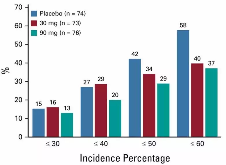 此外,治疗组并未发生GC4419特异性毒性反应,研究组中与顺铂的调强放射治疗的已知毒性也没有增加。与GC4419或顺铂相关的最常见不良事件包括1级或2级恶心(安慰剂,75%;30 mg GC4419,68%;90 mg GC4419,82%)和呕吐(47% vs. 52% vs. 49%)。