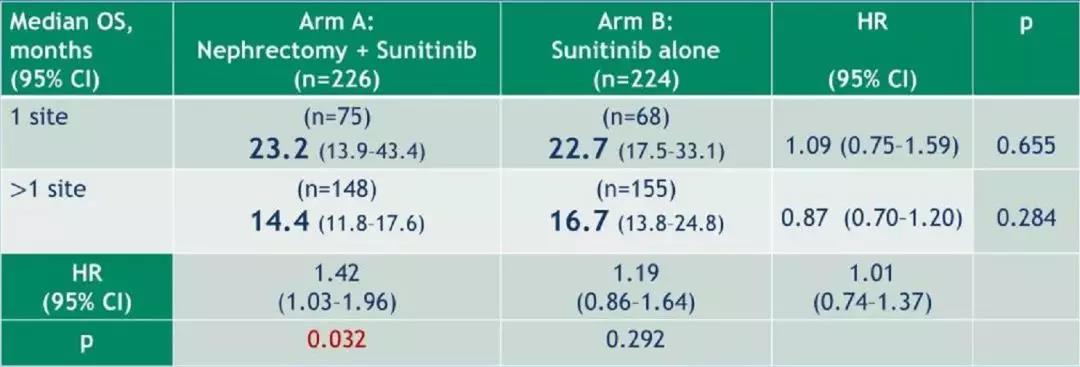 此次分析同样表明,对于IMDC中危患者,单独靶向治疗仍非劣效于减瘤术联合靶向治疗(靶向组和减瘤组:27.9 vs. 19.0个月,HR 0.94),但其中存在2个危险因素患者的OS获益有显著差异(靶向组和减瘤组:31.2 vs. 17.6个月,HR 0.63,P=0.033),而1个危险因素患者的OS在绝对值上更优(靶向组和减瘤组:25.2 vs. 31.4个月)。相较于2个危险因素或>1转移灶患者,减瘤术在1个危险因素或1个转移灶患者的OS获益更显著(2个因素和1个因素:17.6 vs. 31.4个月,P=0.015;>1转移灶和1个转移灶:14.3 vs. 23.2个月,P=0.032)。