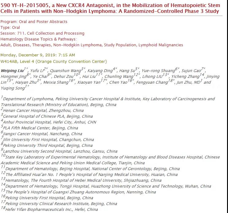YF-H-2015005是CXCR4的强力特异性拮抗剂,能通过阻滞SDF1与CXCR4的结合而最终呈现CD34+细胞动员效应。Ⅰ期临床试验发现YF-H-2015005用于非霍奇金淋巴瘤造血干细胞动员时具有良好的安全性,也获得了很好的干细胞采集效果,该结果在2019年欧洲肿瘤学会年会上以壁报的形式进行了交流。