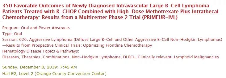 背景:血管内大B细胞淋巴瘤(Intravascular large B-cell lymphoma, IVLBCL)是一种罕见的疾病,主要表现为淋巴瘤细胞选择性的浸润生长在小血管管壁上。为了提高对该病的认识,WHO分类中专门将其列出。然而,对于该亚型的治疗目前尚无基于前瞻性临床试验结果得出的标准治疗方案。先前报道中含有利妥昔单抗的方案治疗IVLBCL展现出了应用前景,但中枢神经系统复发风险仍然很高(中枢神经系统复发率为3年25%)。为探讨更有效的一线治疗方案,研究者进行了一项Ⅱ期临床研究,应用R-大剂量MTX(R-HDMTX)及鞘内注射甲氨蝶呤、阿糖胞苷与泼尼松龙等R-CHOP方案联合,进行中枢神经系统预防性化疗。
