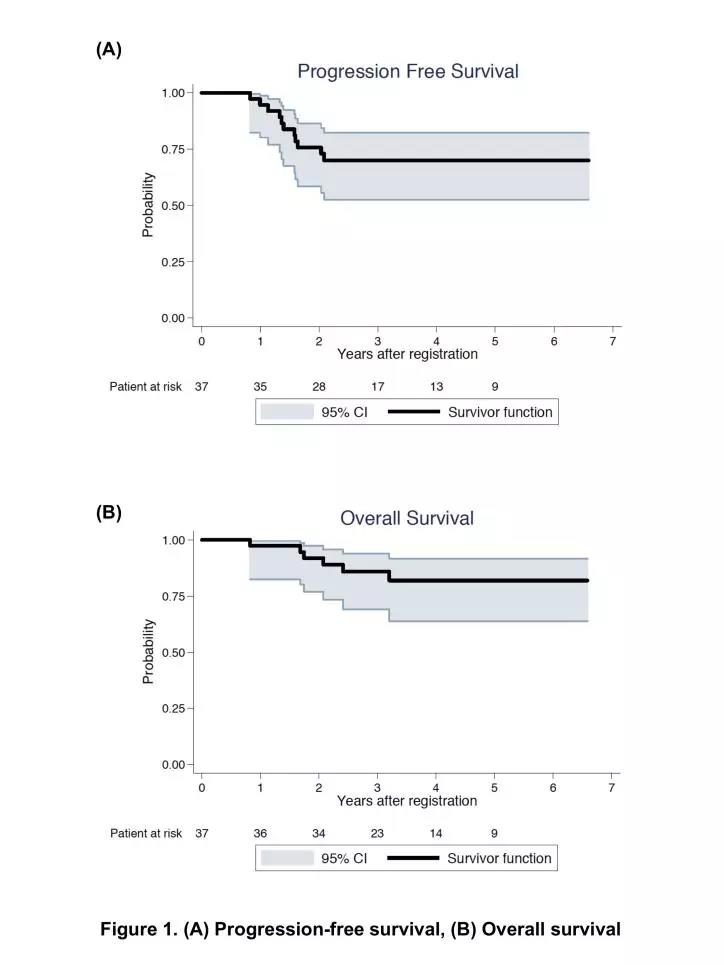 结果:2011年6月至2016年7月之间入选了38例IVLBCL患者。其中1例患者完成了治疗方案后发现其既往曾患淋巴瘤,该例患者评为不合格病例。38例患者中34患者(89%)按照方案要求完成了治疗。所有入组的IVLBCL患者病理均经中心病理诊断明确。37例合格病例基线特征如下:男性16例(43%),中位年龄66岁(范围38~78岁),ECOG评分>1者15例(41%),Ⅳ期 37例(100%),LDH高于正常值者36例(97%),WBC<4000/uL者11例(30%),Hgb<11g/dL者30例(81%),血小板<105/uL者17例(46%),IPI评分HI/H者33例(89%)。治疗前临床表现主要如下:B症状,低氧血症,神经系统症状,皮疹,肝肿大,脾肿大及嗜血细胞综合症。在37例合格病人中,CR率84%(95%CI:68-94%)。中位随访3.9年(2.0-6.6),2年PFS为76%(95%CI: 59-87%),2年OS为92%(95%CI:77-97%),2年中枢神经系统复发的累积发病风险为2.7%(95%CI: 0.2-12%)(图1)。在随访期间仅有1例患者出现了中枢神经系统复发。入组的38例患者中未发生治疗相关的的死亡,4级非血液学不良反应分别为中性粒细胞减少性发热、低钾血症及低血压,各为1例。3级非血液血毒性主要为中性粒细胞减少醒发热及低钾血症。3/4级淋巴细胞减少发生率分别为95%及50%,3/4级血小板减少发生率为40% 及24%。所有的毒性反应均可控。