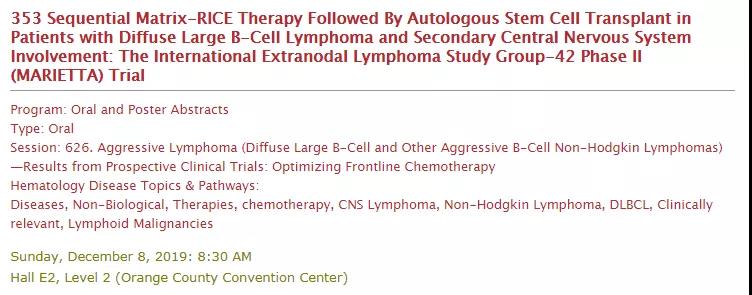 国际淋巴结外淋巴瘤研究第42组Ⅱ期(MARIETTA)试验:Matrix-RICE序贯治疗后行自体造血干细胞移植治疗继发中枢神经系统受累的弥漫大B细胞淋巴瘤