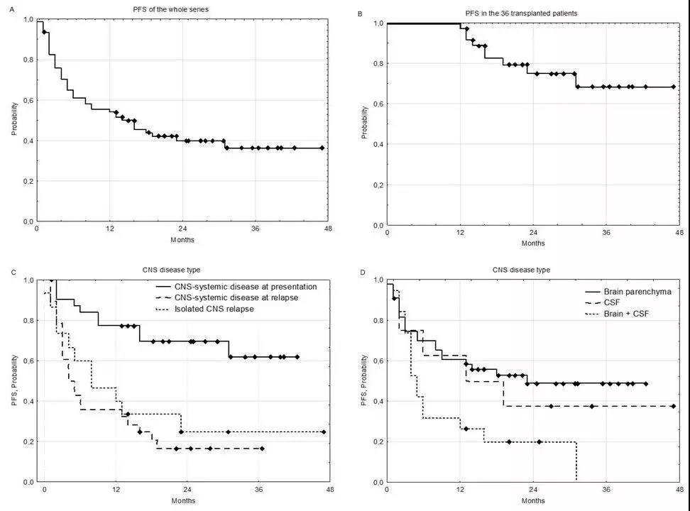 41例患者在入组该研究1年时处于疾病无进展生存状态(有效阈值≥41)。中位随访25个月(12~47个月)时,31例患者处于疾病无进展生存状态,总体2年PFS为42±6%,接受移植的36例患者的2年PFS为75±7%(图A&B)。18例复发/进展的患者中,10例患者复发部位为中枢神经系统,9例患者为中枢神经系统以外的脏器。总体而言,该研究纳入的病人33例存活,2年OS为42±6%;其中接受移植患者的2年OS为82±7%。导致死亡的原因如下:35例患者死于淋巴瘤进展,4例患者死于毒性反应,3例患者死因与淋巴瘤无关,分别为神经系统功能减退、肺栓塞(PTE)及猝死。